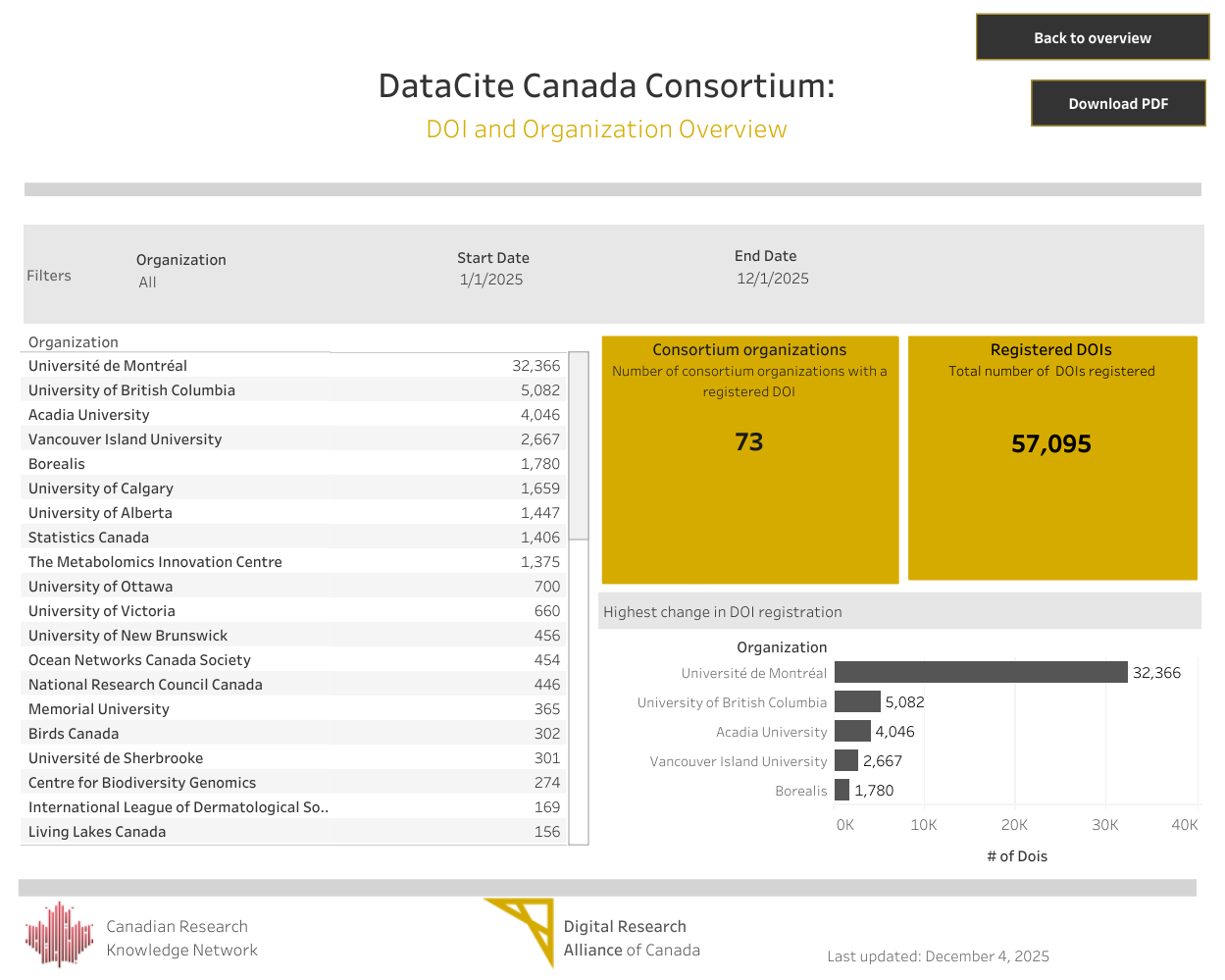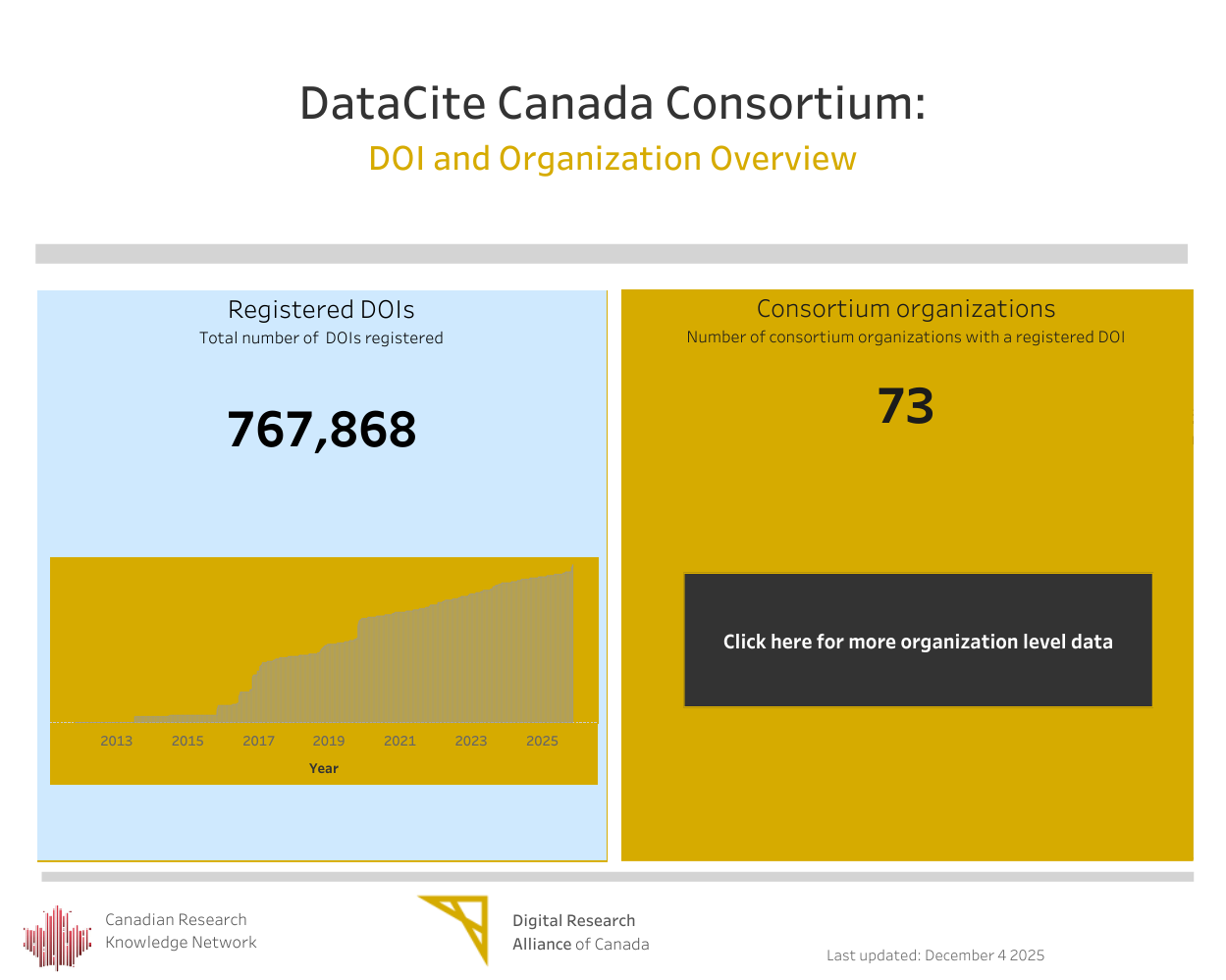 This year, we continued work on new tools to better showcase and visualize consortium activity. As part of this effort, our colleagues at the Alliance developed the DataCite Canada Metrics Dashboard, designed to make DOI registration data easier to explore and report to our PIDs committees and, eventually, to provide insight to the broader Canadian research community.